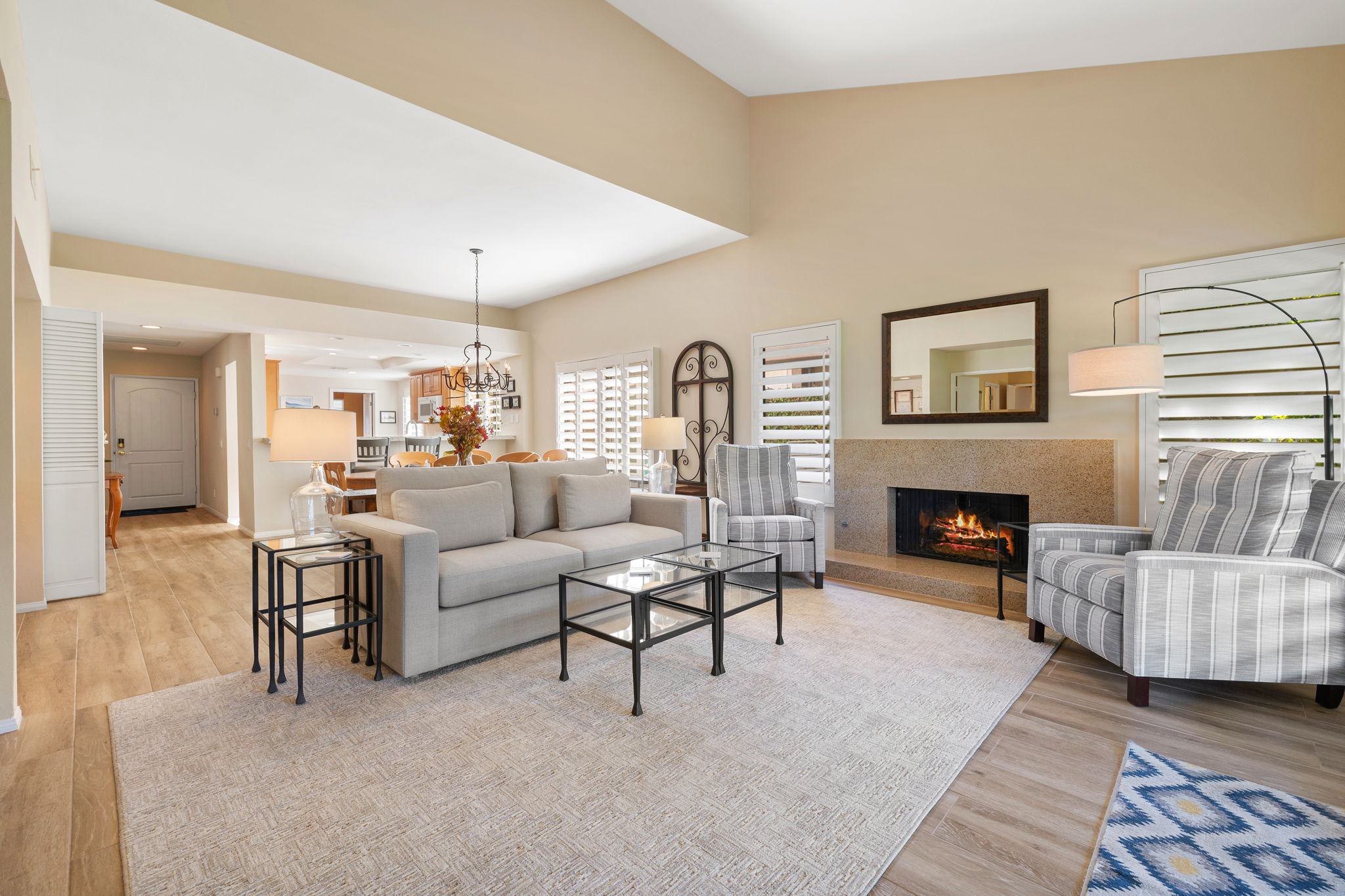 Enjoy this light and bright setting on a lush greenbelt near pool and spa. The popular 2 bedroom plus Den has been updated and remodeled with indoor laundry room off the kitchen. Two bedrooms nicely separated by the Den and living area. Fireplace, walk in closet and new AC/furnace. Kitchen counters and appliances are new, as is tile flooring in kitchen, baths and living area with carpeting in bedrooms and Den. This HOA currently has a 7 day rental minimum. Ironwood is a secure gated community near El Paseo and Living Desert. 2 private golf courses, tennis, pickleball, fitness and dining are available by membership only.