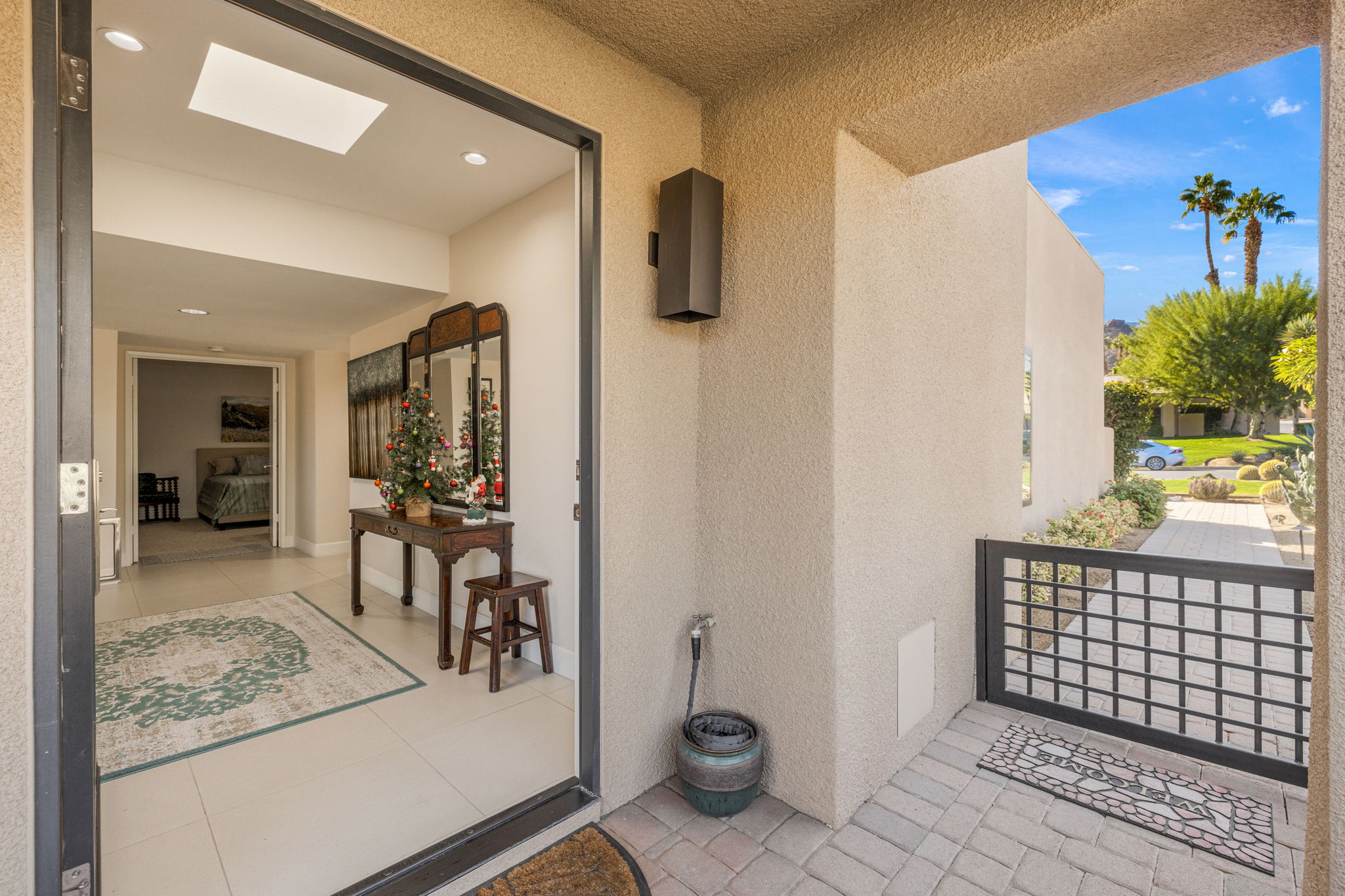 Great corner location with mountain views and private gated patio. Popular 2 bedroom 2 bath floorplan with fireplace and added office plus family room/den. Attached double car garage has epoxy flooring, built in cabinets, laundry and newer HVAC and water heater. Great living spaces with beautiful kitchen, stainless appliances and quartz counters. Kitchen is open to Living room and Family room. Primary bath has walk in tiled shower. Guest suite has attached bath and added office with skylights. All sliding doors and windows are updated. Enjoy sunrise and moonrise over Mt. Eisenhower from the spacious patio. Great views and privacy. Patio is tiled and walled for privacy. Walkway and driveway are interlocking paver stones. Impressive desert landscaping is beautifully maintained. Some items of furnishings are included. Located in the heart of the Club just a short walk to clubhouse and tennis/fitness facilities. Ironwood is a private member owned golf community. Access to facilities is by membership only. Golf cart may be negotiable.