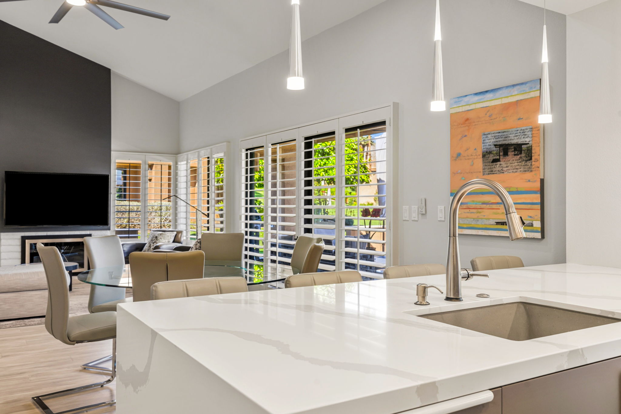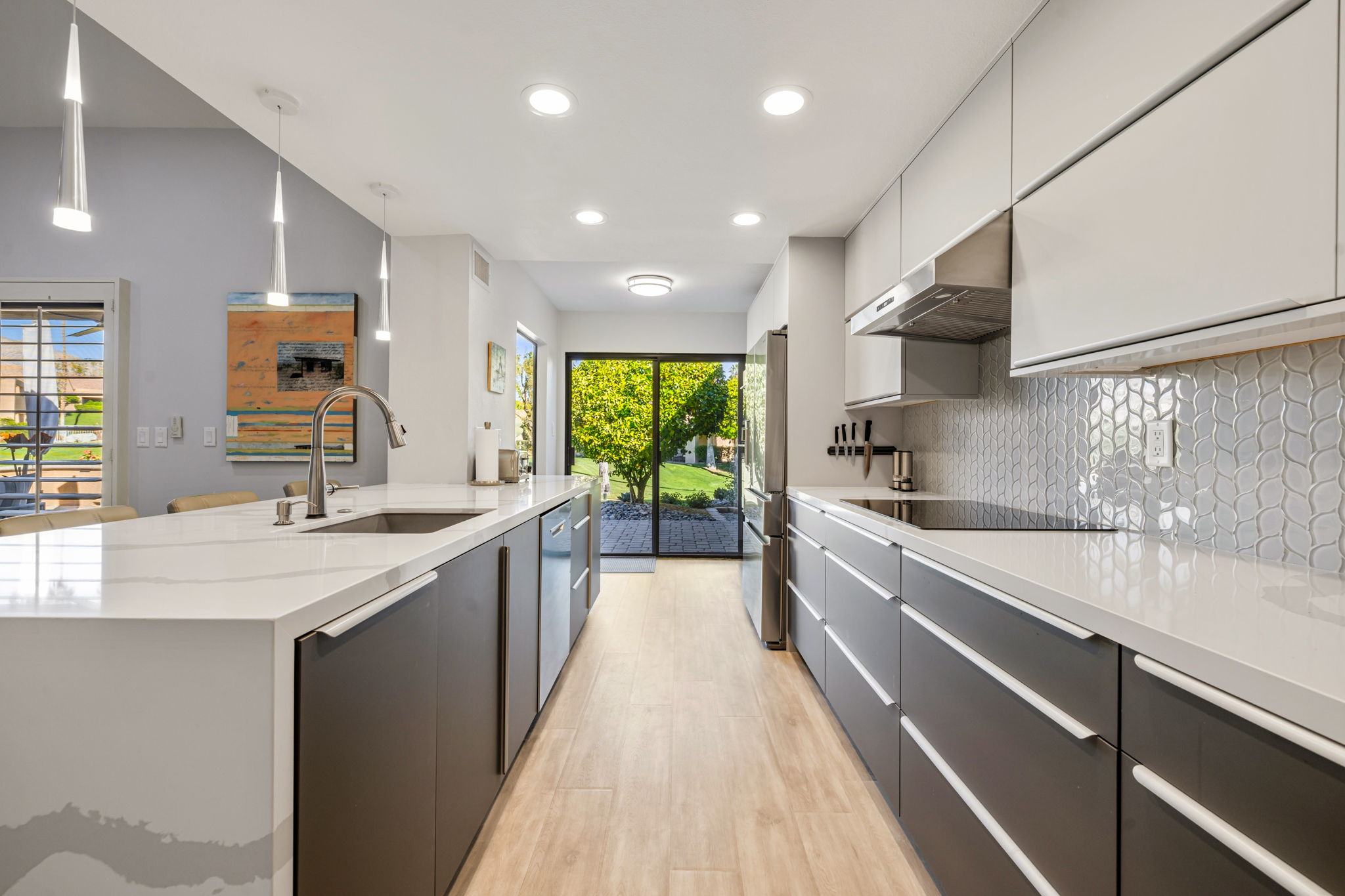 Enjoy views of sunset and mountains from this expanded wrap around patio area. Located on a lush greenbelt near pool/spa. 2 bedrooms 2 baths with fireplace and double attached garage. Updated modern kitchen with stone countertop. induction stovetop and custom cabinetry. Laminated wood flooring. Baths are remodeled with walk in showers. New interior doors and trim. Guest bedroom closet has been partially converted to office space. Garage is customized with epoxy floor, newer washer/dryer and added sink. HVAC system and water heater are recently replaced. Pavers installed on driveway, walkway and patio areas. Beautiful villa in a serene setting offered furnished per inventory. This HOA has 7 day minimum rental restriction.